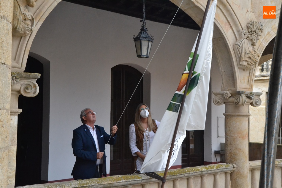 La fachada de la Casa Consistorial de Ciudad Rodrigo luce entre sus banderas este viernes 1 de octubre una diferente a lo habitual, ya que se ha incorporado la de la Asociación de Los Pueblos más Bonitos de España de la que forma parte Miróbriga, para sumarse a la celebración del Día de esta Asociación, que precisamente este fin de semana (desde el viernes hasta el domingo) tiene su IX Asamblea Nacional en Peñíscola (Castellón).