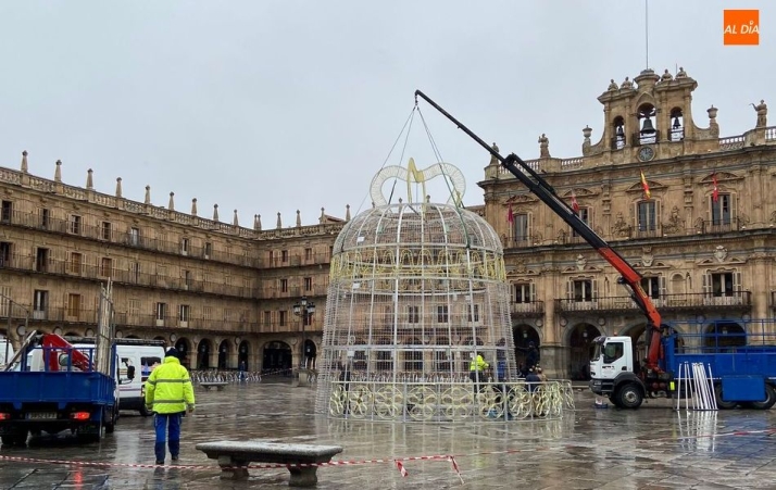 Este lunes comenzaban a montar en la Plaza Mayor la gran novedad de este año, en lo que a los adornos navideños de la ciudada se refiere. Se trata de de la instalación de una campana de 13 metros de altura, inspirada en la campana grande de la Catedral, conocida popularmente como 'María de la O', que sustituirá al motivo luminoso en forma de regalo que en los últimos años se colocaba en el centro del ágora.