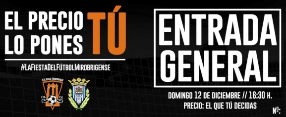 Con el objetivo de despedir el año como locales con el mayor número posible de aficionados, el Ciudad Rodrigo CF ha decidido seguir la iniciativa lanzada hace unas semanas por Unionistas de Salamanca y permitir que cada persona pague lo que quiera por entrar a ver el partido que jugará a las 16.30 horas del domingo 12 en el Francisco Mateos frente a la Arandina. De este modo, cada persona podrá coger un máximo de 2 entradas, abonando lo que quiera, el viernes de 18.00 a 22.00 horas, y el sábado de 12.00 a 14.00 y de 18.00 a 21.00 horas en la taquilla del Francisco Mateos (se deberá presentar un documento de identidad). Según señalan en un comunicado la plantilla y el cuerpo técnico del Club, "necesitamos que el estadio registre la mejor entrada de toda su historia, tiene que haber un gran ambiente en el campo, para ganar os necesitamos y debemos acudir a todos vosotros; necesitamos el aliento de todo el pueblo más que nunca, ayudarnos".