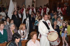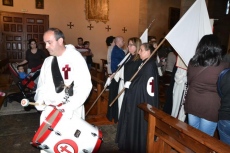 Una vez la imagen ya estuvo abajo, entraron en la Iglesia otros miembros de la Cofradía, en su caso con túnica, a la par que sonaba uno de los característicos tambores de esta Cofradía. A partir de ese momento, todos aquellos que lo desearon pudieron pasar a besar los pies del Cristo.