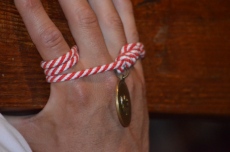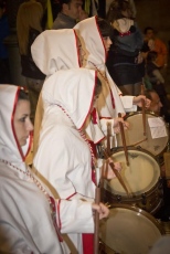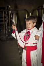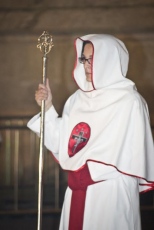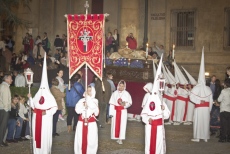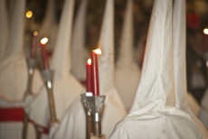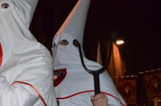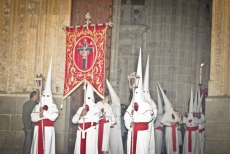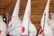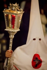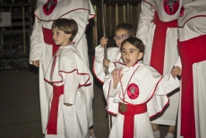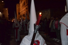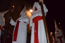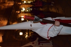 Los cofrades van ataviados con túnica blanca, fajín y caída roja, capirote de 90 cm., en blanco y ribeteado en rojo, con el emblema de la cofradía en el pecho. Se completa con zapatillas de esparto blancas y la medalla de la Cofradía.