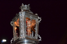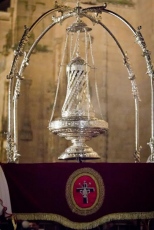 Procesiona sobre andas en madera de abedul, oscurecidas en color nogal data del año 1993, cuyo autor es Agustín Cruz, cantoneras de los banzos son en bronce plateado, hachones son toreados de madera con adornos en alpaca plateada realizado por "Orfebrería Orovio de la Torre" y guardabrisas con porta velas realizados por el mismo orfebre, y faldones en terciopelo rojo.