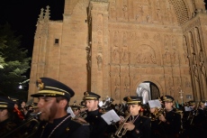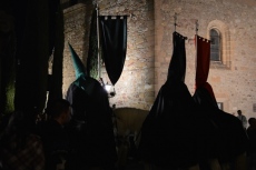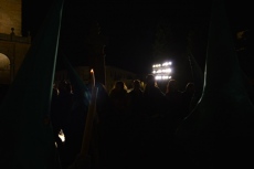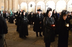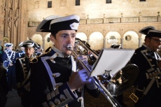 Destaca la sección de cofrades que desfila, precediendo el paso de Ntra. Sra. de la Esperanza, vistiendo el típico traje charro de luto y alumbrando con faroles.