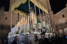 Desfila sobre andas talladas y doradas en 1991 por Vicente Cid Pérez en estilo barroco, con cuatro cartelas representando distintos momentos de la Pasión (flagelación, encuentro con la Verónica, descendiento y entierro) y figuras exentas de los Evangelistas en las esquinas de la canastilla.