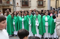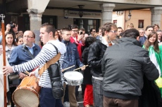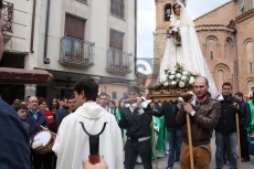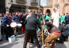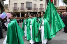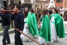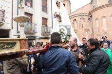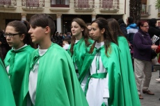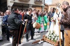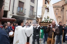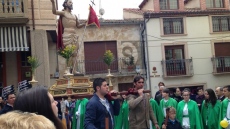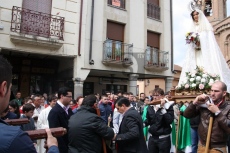 Desde la iglesia de San Pedro partía la procesión del Resucitado. Desde la iglesia de San Juan partía María, su madre y como es habitual los dos se encontraron en la Plaza Mayor. Es en ese momento cuando la Virgen de la Alegría se quita el luto y descubre su manto de radiante blanco, se levanta y suena el himno de España.