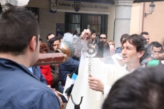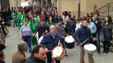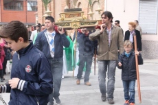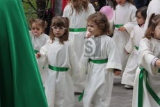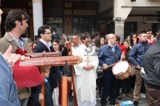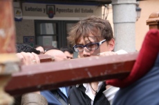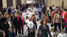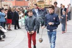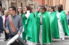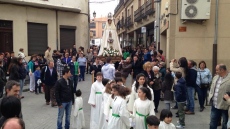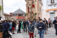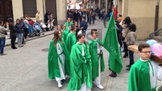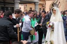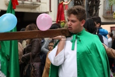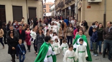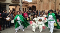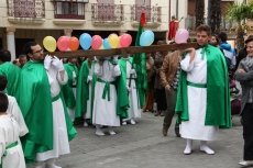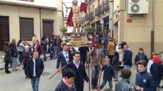 Otra de las peculiaridades del desfile es el ritmo alegre y muy vivo que marcan los tambores. A paso rápido y acompañados por la Cofradía de la Cruz y del Amor, llegaron los dos pasos a la iglesia de San Pedro. La procesión del Encuentro supone el punto y final de la Semana Santa albense en la que una vez más estuvieron los niños que aportaron alegria con sus gestos y colorido con globos a la procesión de hoy.