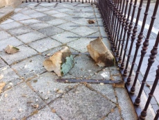 Los hecho se han producido durante la madrugada y el desprendimiento afecta a unos 70 centímetros de la cornisa de la iglesia de San Juan de la Cruz de los Carmelitas. La Policía Local ha acordonado la zona y según fuentes municipales "no se descartan más desprendimientos por el estado en el que se encuentra el tejado, pendiente de restauración".