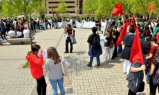 A las 13.00 horas de este 8 de mayo daba comienzo la manifestación convocada por colectivos y asociaciones estudiantiles en la Plaza de Bolonia que ha recorrido las principales calles de la ciudad hasta llegar a la Plaza Mayor.
