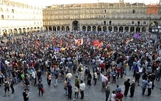 Desde las 20.00 horas se han visto en el ágora salmantina pancartas reclamando la convocatoria de un referéndum que permita a los españoles decidir qué tipo de Estado quieren. Se han oído gritos y lemas a favor de la desaparición de la monarquía en España acompañados de banderas y camisetas republicanas.