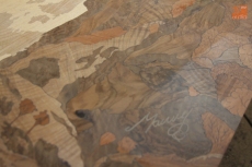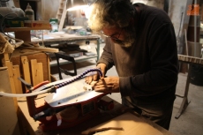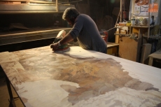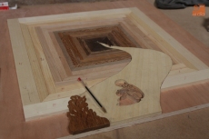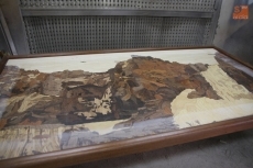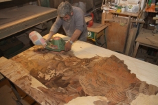 Tras el ensamblado de las piezas mediante encolado, el proceso continua con el lijado y pulido del cuadro, para concluir con su barnizado, una capa de resina que protegerá la obra de la intemperie durante años.