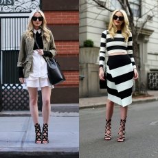 Pero también hay otro tipo de sandalias de tiras que consiguen alcanzar la sofisticación gracias a finos y altos tacones. Aunque las tiras puedan subir por la pierna varios centímetros no la acortan ya que el tacón se encarga de estilizar toda la figura. Lo que sí tenéis que tener en cuenta es el largo de la falda o el pantalón, si no eres muy alta cuanto más corta sea la prenda, mucho mejor.