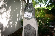 Carteles con el lema 'No a la ley mordaza' han sido colgados sobre las estatuas de personajes relevantes de la ciudad