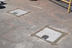 En la mañana del martes, operarios municipales continuaron con el proceso ?iniciado en la mañana del lunes- de colocación de la base de estos nuevos bolardos, que serán desmontables (iguales a los que hay en la intersección de la calle Sánchez Arjona con Juan Arias). Cuando no sean necesarios, se engancharán a las jardineras de la Plaza, según explicó en la mañana del martes el Jefe de la Policía Local, Narciso Caridad.