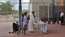 Las fiestas del barrio de Vistahermosa se retomaban este domingo con una celebración religiosa, en la pista polideportiva, tras la que ha tenido lugar el tradicional vino de honor.
