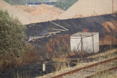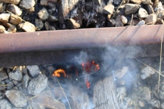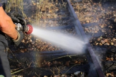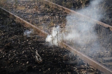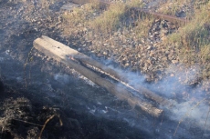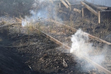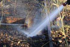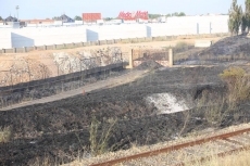 Dos dotaciones de bomberos se emplearon durante tres horas, desde las seis de la tarde a las nueve de la noche, en las tareas de extinción del incendio, que se complicó al quemarse los maderos de la antigua vía de ferrocarril.