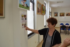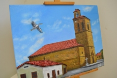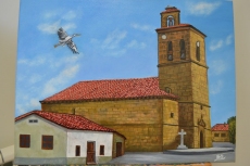 La cantalpinesa Soledad Esteban Martín expone sus pinturas como apoyo a la investigación contra el cáncer. Uno de sus cuadros, en el que se refleja la iglesia parroquial de San Pedro, será sorteado por la asociación de mayores entre los vecinos que adquieran las papeletas solidarias.