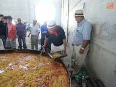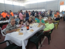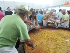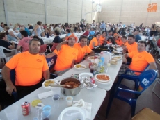 Desde primera hora de la mañana, los grupos fueron instalando sus mesas en el pabellón. A su vez, miembros de la Asociación de Mayores Hogar del Pensionista se encargaban de organizar la comida. Un arduo trabajo, entre cortar el pollo, los calamares, la carne y todo lo necesario para elaborar unas 1.500 raciones de paella. Un plato que se cocinó en una gran paellera en el mismo pabellón.