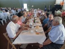 Los jubilados disfrutaron de la invitación municipal, con un menú servido por Barbacoa La Amistad, consistente en jamón de la tierra, langostinos dos salsas, tostón asado, helado y café. Al terminar los postres, las reinas y damas, entregaron a cada uno de los asistentes un obsequio por parte del Ayuntamiento. Las mujeres recibieron un bolsito, y los hombres, un cinturón.