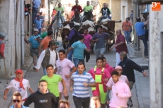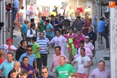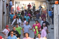 Los cuatro novillos de Raquel Rodríguez 'Valrubio', coloraos, seguían de forma agrupada a los mansos cuando entraban en los últimos 200 metros del recorrido, donde les aguardaban decenas de corredores que un día más se colocaban delante de la manada para entrar en la plaza, en esta ocasión con menos público que días anteriores, aunque en cualquier caso numeroso.