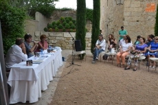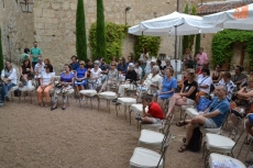 Dos de los integrantes de Teloncillo, Ana Gallego y Ángel Sánchez, fueron explicando la historia de su compañía a los Amigos del Teatro congregados en la tarde sabatina en uno de los patios interiores del Palacio de Montarco.