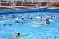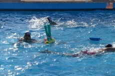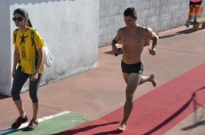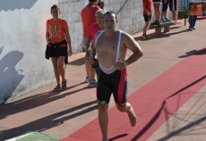 El arranque del triatlón fue en las piscinas del Complejo, debiendo los atletas inscritos dar 10 vueltas a una línea delimitadora central, con el objetivo de completar 500 metros a nado. Concluido este segmento, se pasó a la zona de transición, donde fue turno para coger la bici y ponerse el casco. En el caso de los grupos, estaba preparado uno de sus integrantes para recoger el relevo de la persona del grupo que había hecho el tramo a nado.