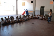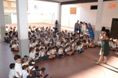 Concluida la presentación en el Salón de Actos, los alumnos de Primaria bajaron al patio para unirse a los de Infantil en la construcción de un tetris con el lema de este curso.