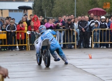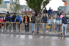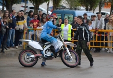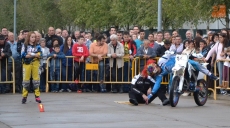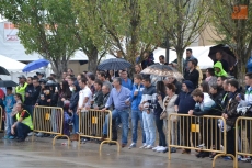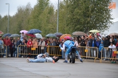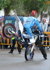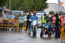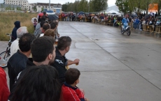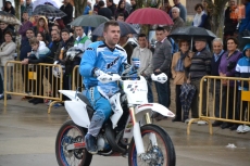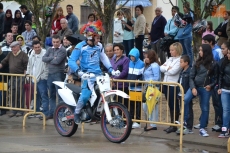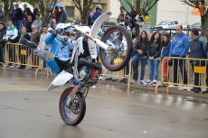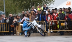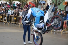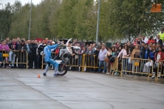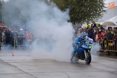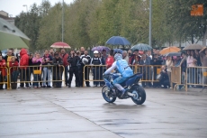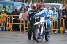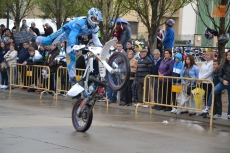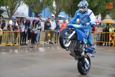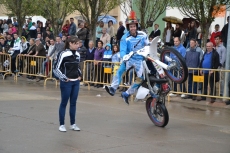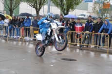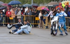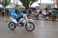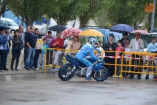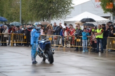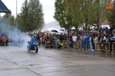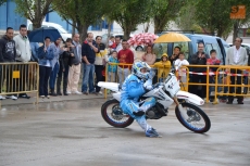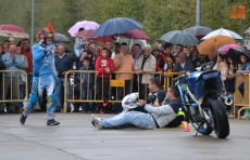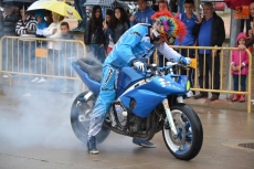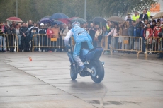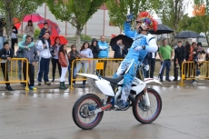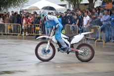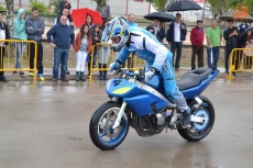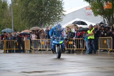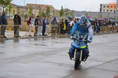 La primera gran actividad del día era una exhibición de stunt riding a cargo de Félix Calvete. Pese a que en el momento de inicio del espectáculo estaba lloviendo, se decidió seguir con el guión programado, y realizarlo en una de las calles del Polígono -el año pasado, cuando llovió, las exhibiciones se trasladaron al interior de la carpa-.