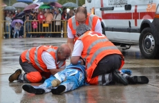 Justo en el tramo del show en que se estaba simulando el accidente comenzó a llover con bastante intensidad, provocando que poco a poco el público congregado para seguir la exhibición fuera a refugiarse a la carpa.