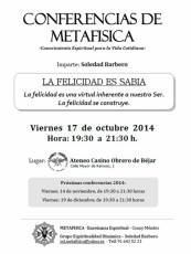 El Casino Obrero de Béjar, acoge una conferencia a cargo de doña Soledad Barbero, el viernes día 17 a las 19:30 horas., bajo el título La felicidad es sabia. La felicidad es una virtud inherente a nuestro ser, la felicidad se construye.