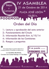 El próximo Martes, 21 de Octubre, a las 18,00 h. Podemos celebrará la IV Asamblea, el lugar elegido en esta ocasión es la plaza José Lidón de Béjar, en caso de que la meteorología impida su celebración en un espacio abierto dicha asamblea se desarrollara en la sede de la Colmena, sita en Carretera Ciudad Rodrigo nº 12 de Béjar.