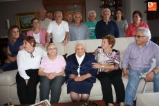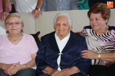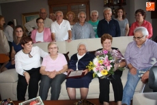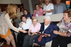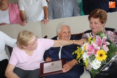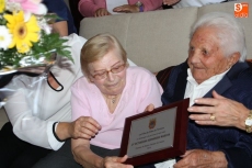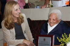 Victorina Hernández Marcos ha recibido hoy el homenaje del pueblo de Alba de Tormes representado en la figura de su alcaldesa, Concepción Miguélez que le ha hecho entrega de una placa como la persona de más edad de la localidad.