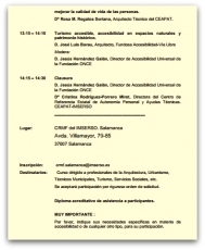 Se trata de un encuentro técnico de gran nivel que se realiza en colaboración con la Fundación ONCE y el Ceapat, que pretende ahondar en los criterios urbanísticos necesarios para promover la accesibilidad universal en los municipios, en el que los participantes tendrán la posibilidad de intercambiar experiencias sobre las dificultades y/o las buenas prácticas en esta materia. Este encuentro en el CRMF de Salamanca, dará la posibilidad de conocer de primera mano cuáles son las dificultades de los planificadores y hasta qué punto se tiene en cuenta el objetivo de accesibilidad