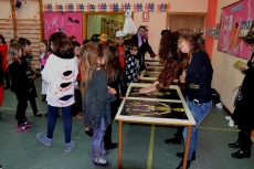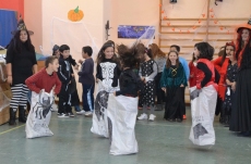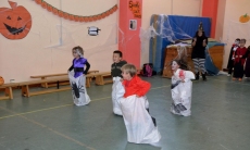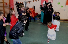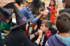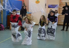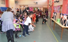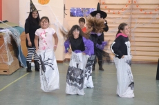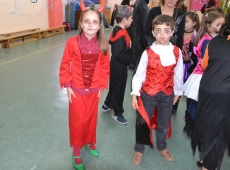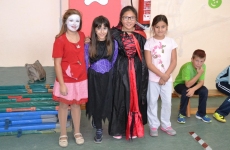 Hasta allí se acercaron por turnos a lo largo de la mañana todos los grupos de Educación Primaria para realizar diversos juegos dirigidos por padres y madres. Esos juegos consistieron en una carrera de sacos adornados al estilo Halloween, un lanzamiento de bolas a unas caras de Drácula, y un juego para recomponer un esqueleto. Además, para aquellos que no hubieran ido pintados de casa, había un punto de maquillaje.