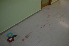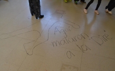 Como se puede ver en las imágenes, lo primero que se encontraban todos los que entraban al Colegio Miróbriga en la mañana del jueves era una silueta humana con la leyenda Aquí mataron a la Dire, junto a varias manchas de 'sangre', iniciándose un reguero de huellas hasta el gimnasio del colegio, donde se centralizaron las actividades.