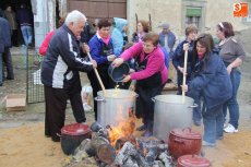 A la llegada del alba, familiares y vecinos se daban cita bajo el portal de la casa que les aguardaba con pastas, aguardiente y vino caliente, calorías suficientes con las que afrontar toda una mañana de duro trabajo hasta la hora del almuerzo. Patatas condimentadas con pimentón y algunos huesos bien descarnados, pues los tiempos no estaban para el derroche y ya serviría la probatura de chichinas en la noche, era recompensa suficiente a la 'altruista' presencia de todo un regimiento.