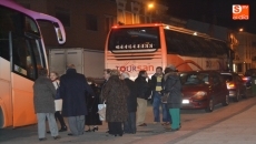 Dos autobuses de la lujosa flota de Viajes Toursan recogían en Salamanca a los participantes de esta jornada, que hacían una pequeña escala en la Plaza de España para iniciar el reencuentro con su tierra en el Teatro Calderón. La 'Comparsa peñarandina' ejercía de maestra de ceremonias ofreciendo un recital con sus temas más conocidos, caldeando el ambiente como paso previo a la comida que tendría lugar en un céntrico restaurante.