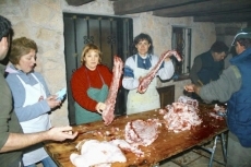 A primera hora de la mañana se dio inicio a las actividades matanceras. El marrano fue sacrificado, chamuscado y despiezado, con acompañamiento de dulces y aguardiente, como toca en tamaña ocasión y las degustaciones de las diversas partes del cerdo en las inexcusables probaduras que catan el buen gusto 'a futuro'. La comida popular estuvo compuesta por patatas meneás y costillas sin que faltara el baile al postre. Una jornada que trajo aromas y sabores de otros tiempos a este municipio serrano.