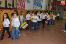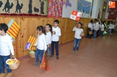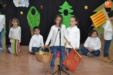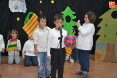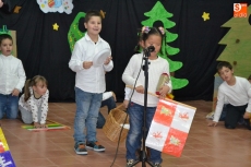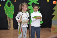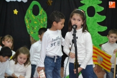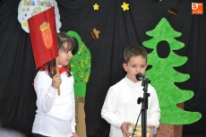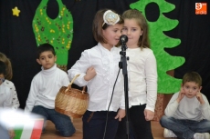 Así, en grupos de 2 ó 3 alumnos, fueron haciendo un paseíllo entre sus padres para llevarle al Niño Jesús productos típicos de cada Comunidad Autónoma española (espárragos de Navarra, naranjas de Valencia, o huevos fritos con farinato de Ciudad Rodrigo en representación de Castilla y León). A la vez que dejaban sus correspondientes productos, los niños recitaron originales rimas con esos productos como protagonistas. La función fue muy aplaudida por sus padres.