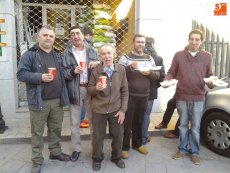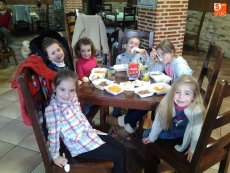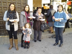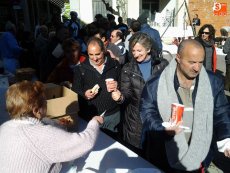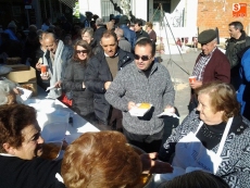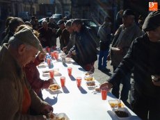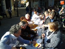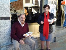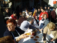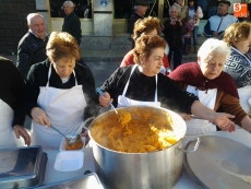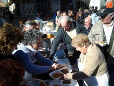 Sobre las dos del mediodía, las mujeres, con sus mandiles blancos, se encargaron de repartir la comida, mientras los hombres, se encargaban de rellenar los vasos de vino de la sierra. En ese momento fue cuando un mayor número de personas se dieron cita en la Plaza Mayor, atraídos por el olor de las patatas meneás y de las chichas.