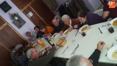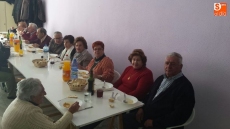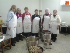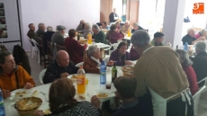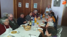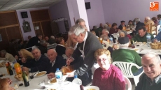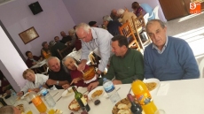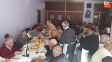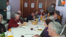 Por la mañana, un grupo de hombres y mujeres se dedicaron a adobar las carnes, seleccionar las piezas y envasarlas para futuros usos. Mientras tanto, otro grupo de socias se encargaban de elaborar un suculento cocido. Orejas, rabos, tocino, rellenos, carne y costilla compusieron junto a los garbanzos y la sopa, el menú que disfrutaron unas 75 personas.