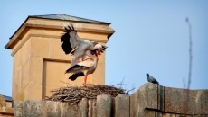 En la imagen, dos cigüeñas juegan en pareja ante la atenta mirada de una paloma, quizás mensajera de sueños de la santa andariega.