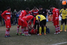 Ni el resultado ni la segunda parte cambiaron para nada la forma de ambos equipos de afrontar el partido. Mientras que Unionistas seguía abogando por controlar el juego el equipo de Alba de Tormes confiaba en que una buena defensa les diera la oportunidad de jugar al contraataque. Aproximadamente cuando el partido se acercaba al minuto treinta de juego, un choque por la pugna de un balón aéreo entre el defensa albense, Abdul y el delantero de Unionistas, Nacho, provocaba que este último cayera mal al suelo. En la caída, Nacho se hacía daño en el cuello, por lo que tuvo que ser sacado del terreno de juego en camilla por los Servicios de Emergencia. A causa de esta desafortunada caída el partido estuvo parado durante quince minutos. Tras la reanudación del juego, ambos equipos intentaron buscar el gol que les pusiera por delante. Ambos conjuntos reclamaron penalti en las dos áreas pero el árbitro no lo señaló, acabando con empate a uno el partido.