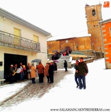 Los actos festivos han continuado hoy, día de San Sebastián, bajo y sobre la espesa capa de nieve que ha cubierto de blanco la localidad lo cual no ha sido obstáculo para que vecinos y amigos de esta localidad salmantina honraran al patrón con solemne misa cantada por el grupo de canto del Hogar de Mayores de Béjar. La procesión, finalmente y por si los cielos, se ha llevado a cabo bajo techo, una marcha simbólica por el interior del templo. Al final la liturgia las mujeres de la Asociación Cultural y del Cristo de Valvanera han cantado el Ramo a San Sebastián. Ese sí, a la intemperie y con valentía femenina.
