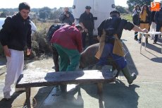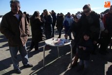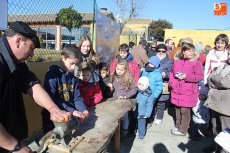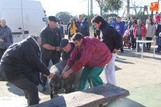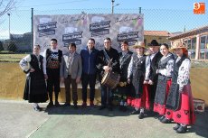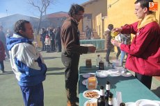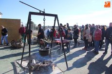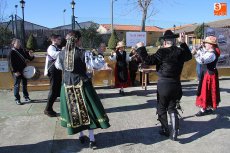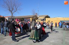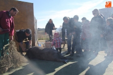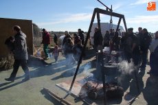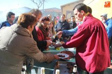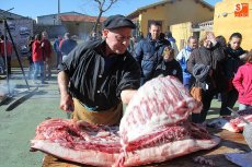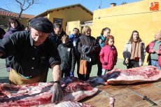 Pero antes de ese bonito momento, que tenía lugar al finalizar la comida, el interés del público se centró en el proceso de la matanza tradicional, que se desarrolló bajo una excelente temperatura, más propia de los albores de la primavera, y que estuvo amenizada por el grupo de folclore de Vitigudino, Organza, con Sergio Vicente a los mandos de la gaita y el tamboril.