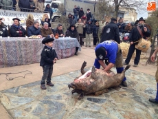 A continuación, el organizador de esta Fiesta de Interés Turístico Regional, Jesús Merino, y el alcalde de Guijuelo, Julián Ramos, dieron la bienvenida a todos los presentes y a los invitados de la Matanza Típica. La mañana estuvo animada por la música de Cartucho y Regino, miembros de Acasan. Antes de comenzar con el nombramiento de los Matanceros de Honor, tuvo lugar el Pregón del Arriero, que en esta ocasión recayó sobre Francisco Javier López, quién ensalzó el valor de esta tradición y lo que supone el sacrificio del cebón.