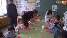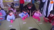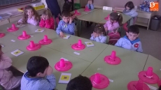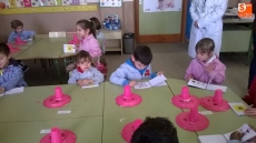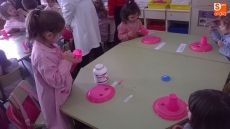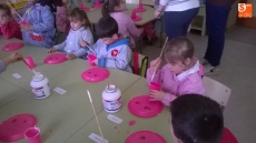 A continuación, y con la ayuda de las profesoras, los actores y los niños elaboraron unas máscaras de cerditos. Para ello utilizaron unos platos y vasos de plástico que pintaron de rosa. Al finalizar, les entregaron el cuento editado en Tamames.