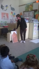 Primero, los alumnos del CO Asprodes de Tamames, Jonathan, Mari, Amaia y Juluan escenificaron el cuento de Los Tres Cerditos, actuando los tres primeros como los cerditos y el cuarto, como el Lobo Feroz, con la ayuda de un montaje teatral sencillo y asequible para todos.