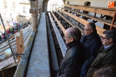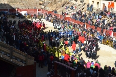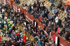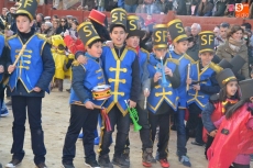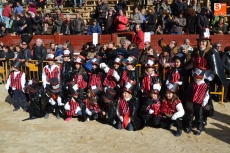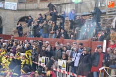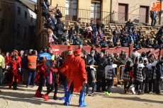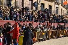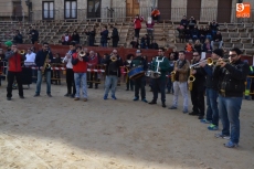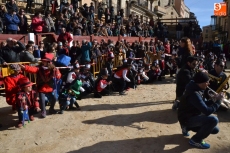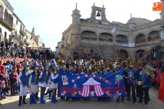 La comitiva continuó por la calle Madrid hasta la Plaza Mayor, donde se encontraron con los alumnos del Colegio El Puente, que habían subido también a vivir el Carnaval al centro de Ciudad Rodrigo. Todos juntos bailaron y cantaron, siendo observados desde la balconada del Ayuntamiento por el alcalde Javier Iglesias, el teniente de alcalde Marcelino Cordero y el presidente de la Comisión Taurina Pedro Muñoz.