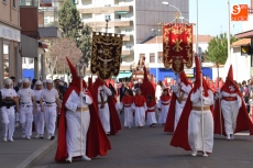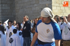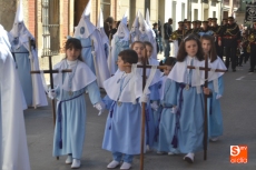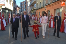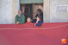 Tras recorrer varias calles del corazón de la ciudad, llegaban hasta el agora donde, tras una breve oración, el pequeño Mario Hernandez Saez convertido en San Miguel, protagonizaba un divertido instante al quedarse sin palabras a la hora de pronunciar la letanía que anuncia la resurrección, momento que era acompañado por una sonora ovación por parte de la multitud de vecinos que se agolpaban en los alrededores de la plaza.