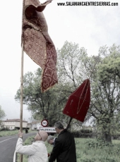 Pendones desplegados, altivos y desafiantes ante un viento que ya amenazaba lluvia, anticiparon la salida del santo de su ermita, engalanado de flores, pergamino y león, al son de la gaita y el tamboril, las mejores enseñas de la fiesta popular en nuestra tierra salmantina.